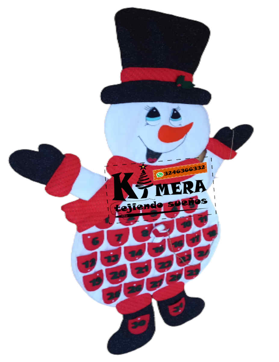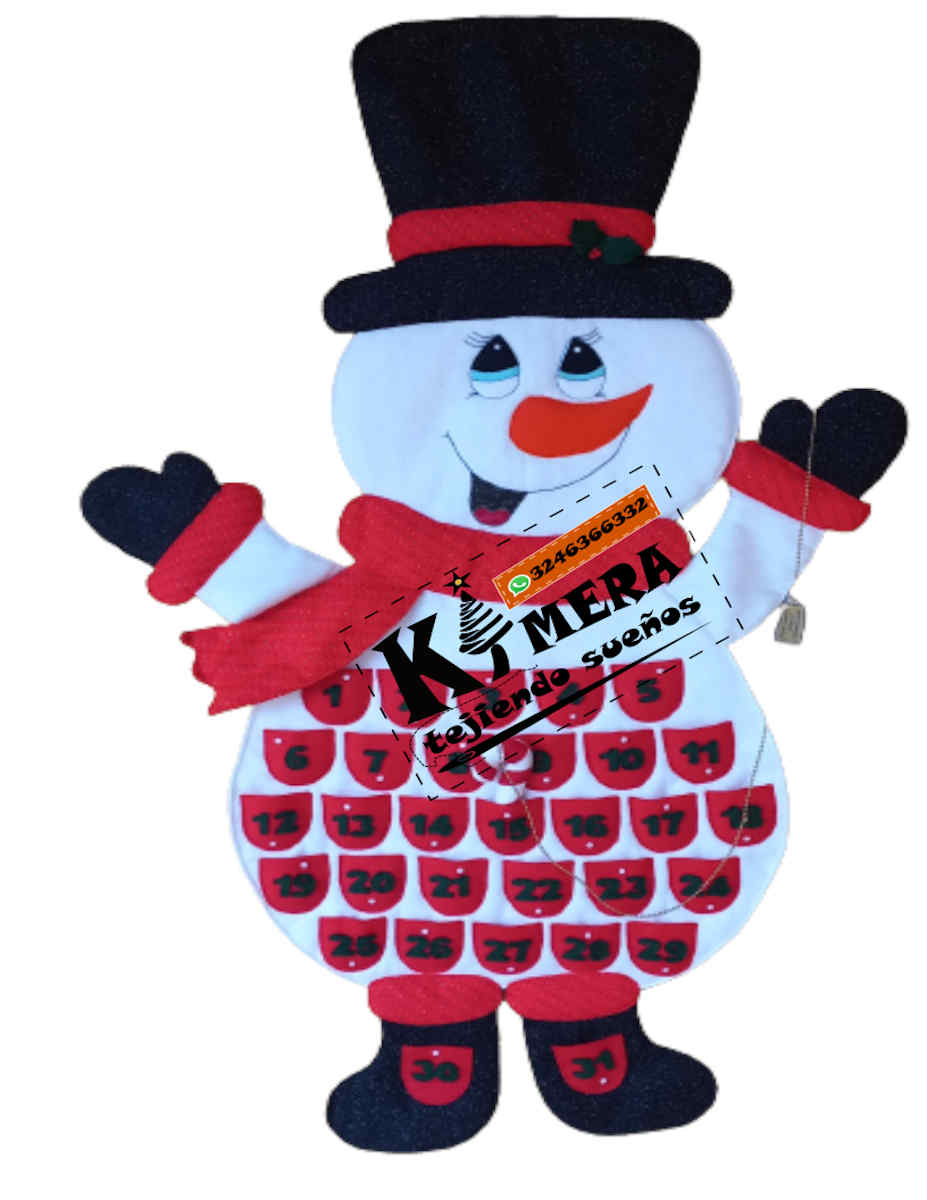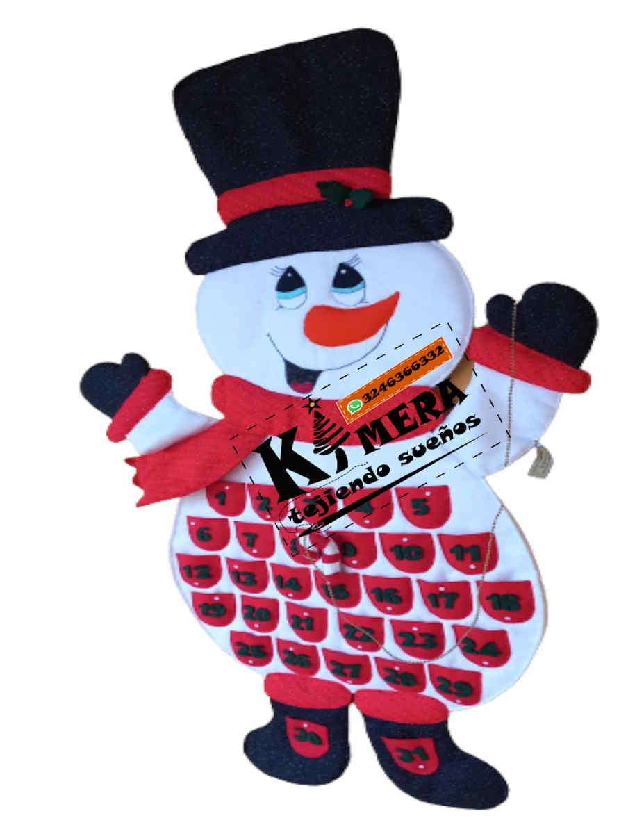 Calendario de muñeco nieve, elaborado con paño lency, cosido a mano.