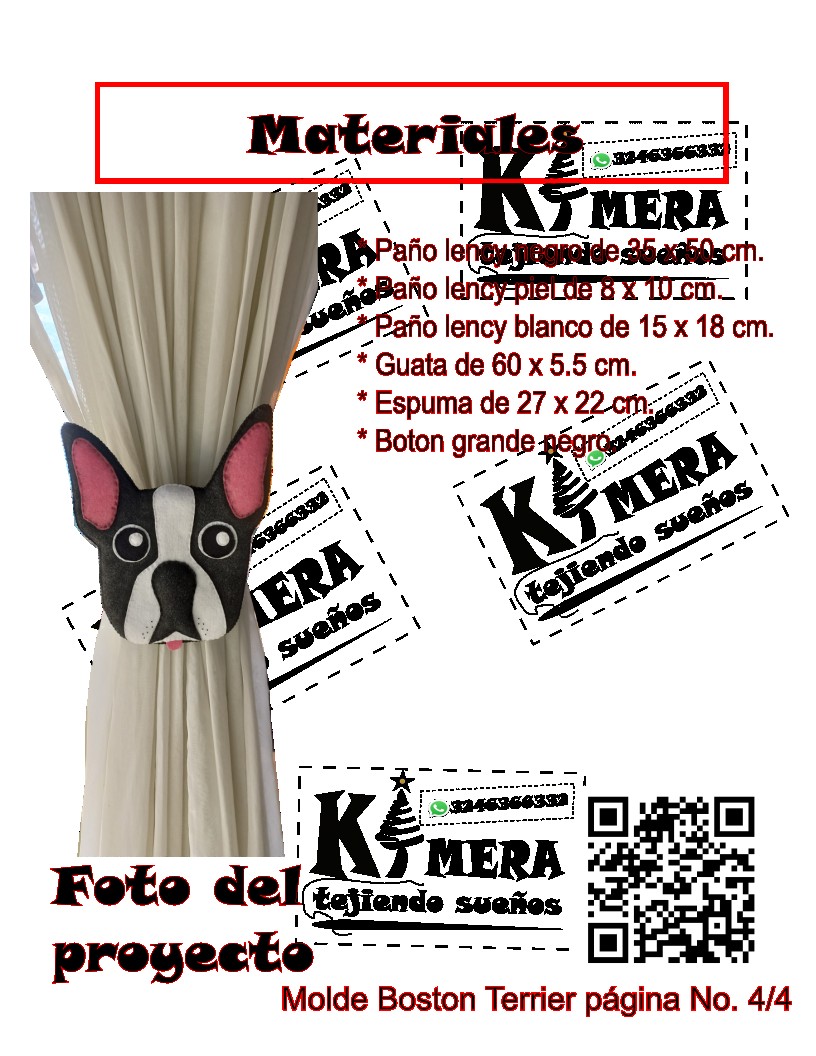 Molde Boston Terrier, para elaborarlo en paño lency, tiene dos tamaños: Cortinero y Prendedor o llavero.